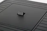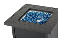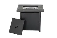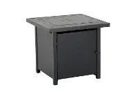The 50,000 BTU 28" square black slatted tabletop propane fire pit provides warmth and ambiance, cozy for both conversation and dining through all seasons.