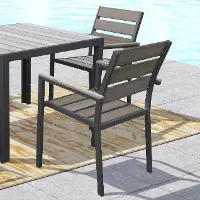 The sleek lines and powder-coated aluminum frame of this chair create an elegant look, while the wide slat surface offers a comfortable seat. Constructed from a durable engineered polymer material, these chairs have the appearance of bleached wood without the necessary upkeep and are UV resistant, which prevents discoloration. This two-piece set is expertly constructed to withstand a range of climates.