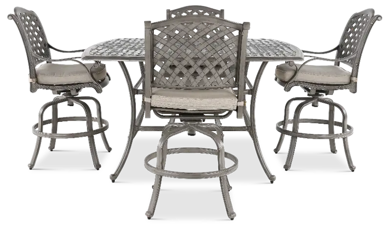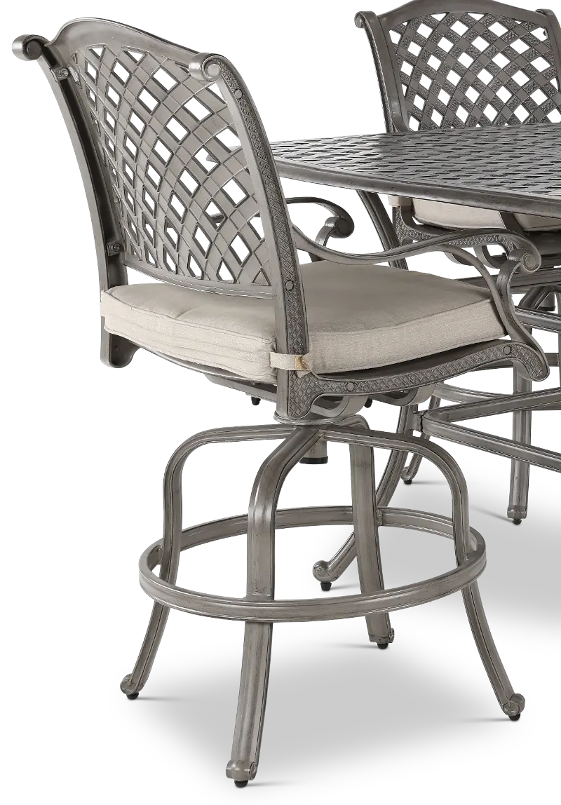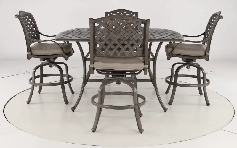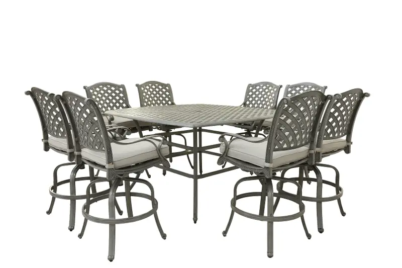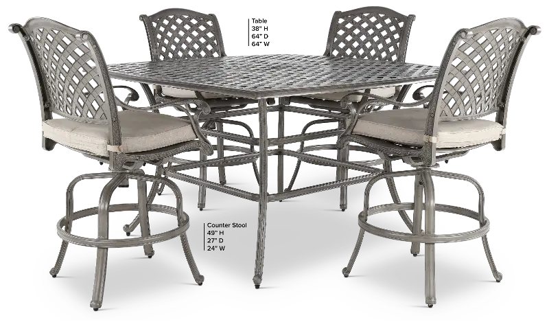 This sturdy aluminum 64" square patio table is the perfect height for your favorite bar stools or chairs. With a traditional style, cast metal frame and timeless gray finish, this bar height table will look great in your backyard. Designed to be a place to gather together and eat outside, you're sure to make great memories this summer around this table.