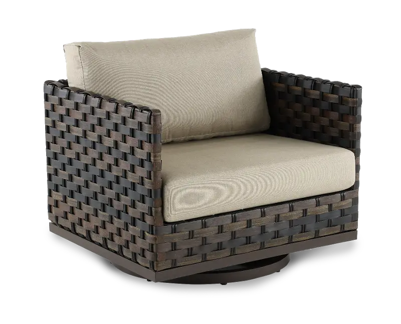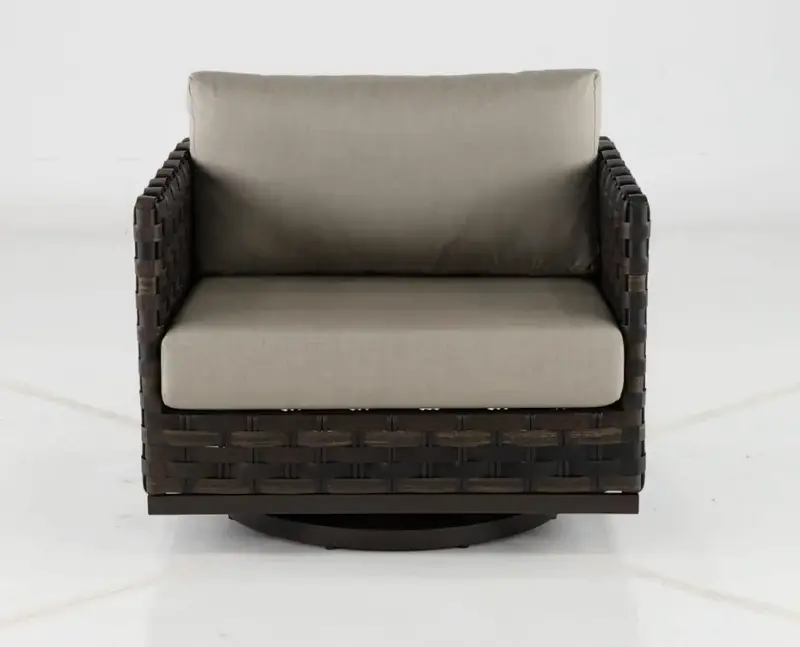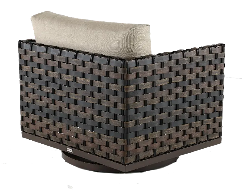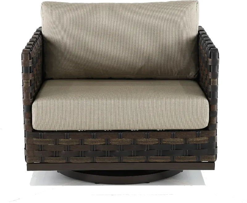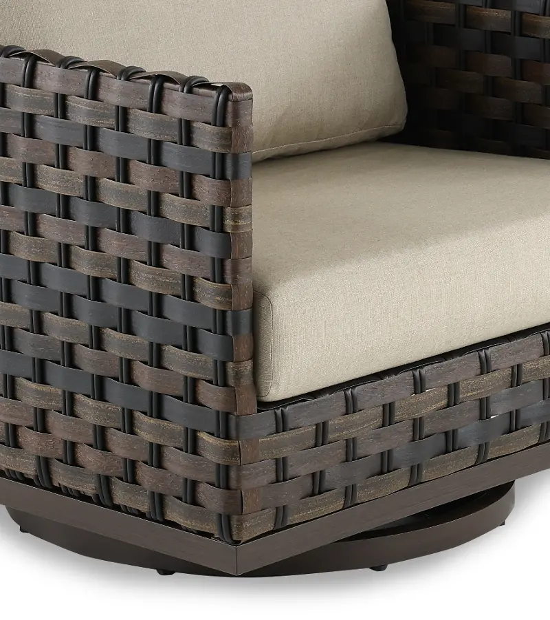 This ash brown wicker style motion chair is sure to become the most coveted seat in the neighborhood. With a comfy, weather-resistant cushion and swivel motion, this seat makes any backyard, THE backyard. Pair it with the rest of the Nevis Collection to complete the look!