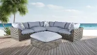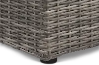The large square frame is wrapped in a rich brown woven wicker on every side. A pale blue denim cushion sits comfortably on top, offering a roomy and comfortable place to enjoy gathering outside on a beautiful day. Complement with patio chairs from the Cirrus collection to pull this stylish look together.