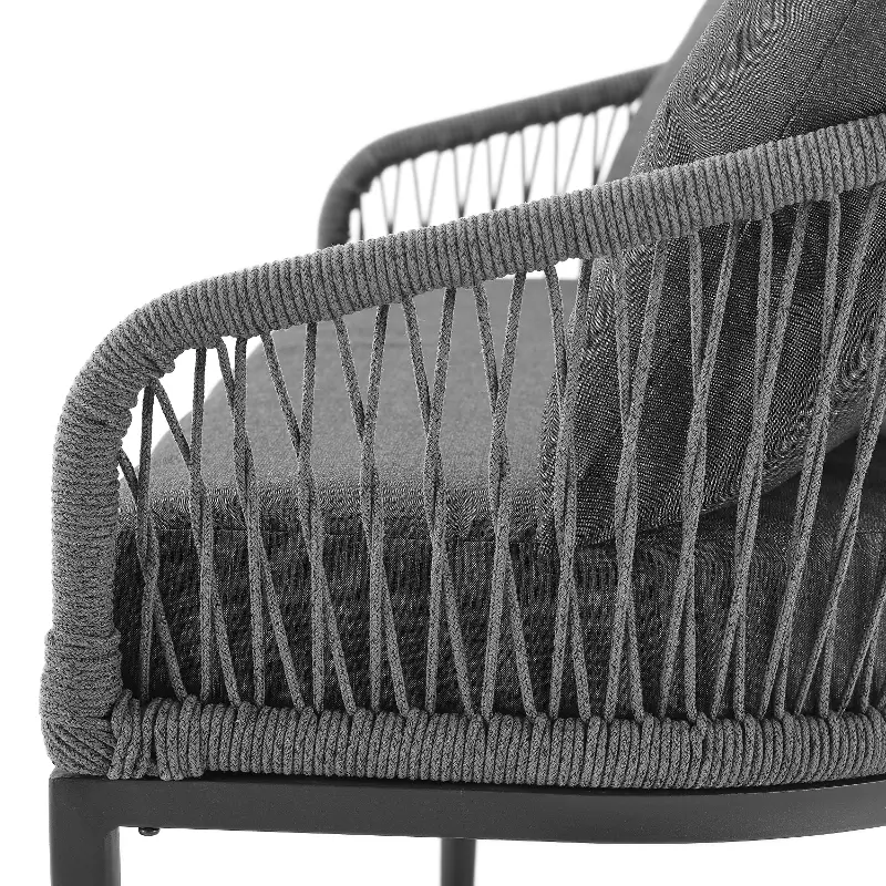 Both the loveseat and coffee table feature powder-coated steel frames, with tapered legs for mid-century flair. The loveseat is handwoven with stylish all-weather rope and includes four loose back pillows for lounging in comfort. Enjoy your next outdoor gathering with the Dover conversation set.