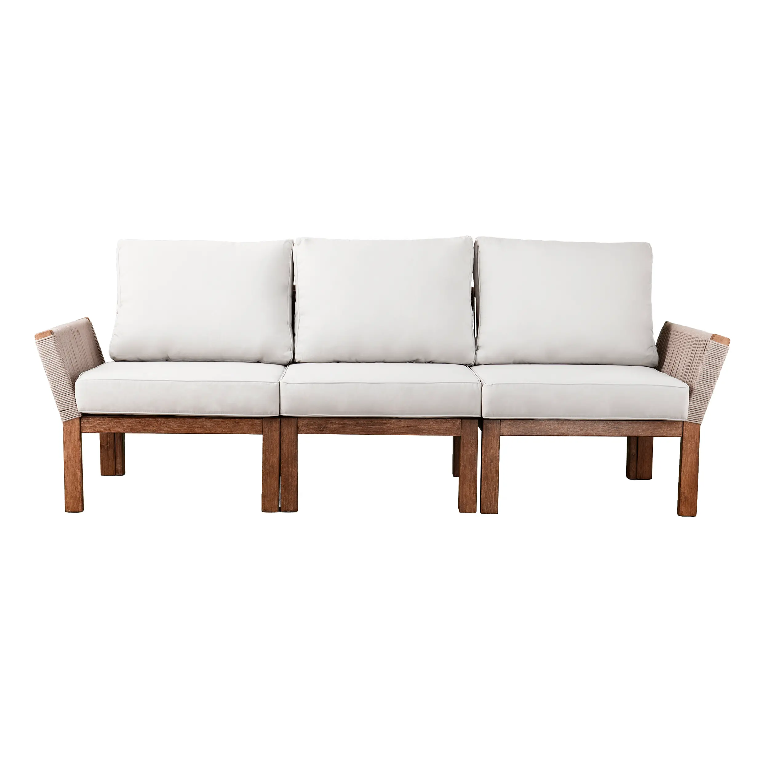The weather-resistant rope wraps up a sturdy acacia frame while you wind down, adding a natural color palette to your outdoor oasis. Plush cushions offer cozy comfort for watching the sunrise or partying under the stars, while the full-sized silhouette leaves ample space for family and guests to drop by. Slide this three-seater sofa onto your patio to serve up appetizers and summer cocktails, or add to your front porch to enjoy breezy mornings with your favorite read.