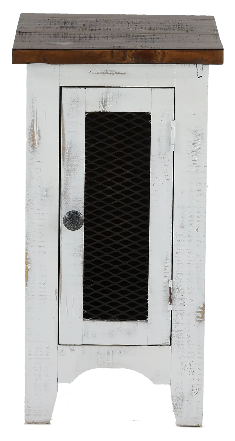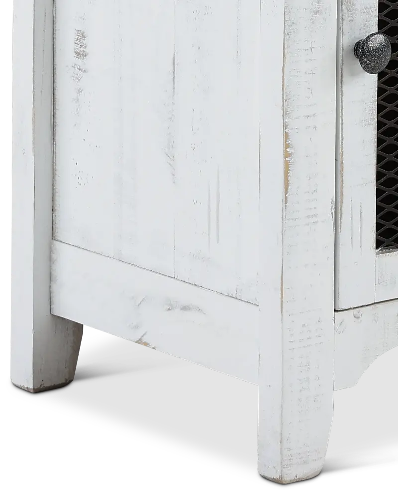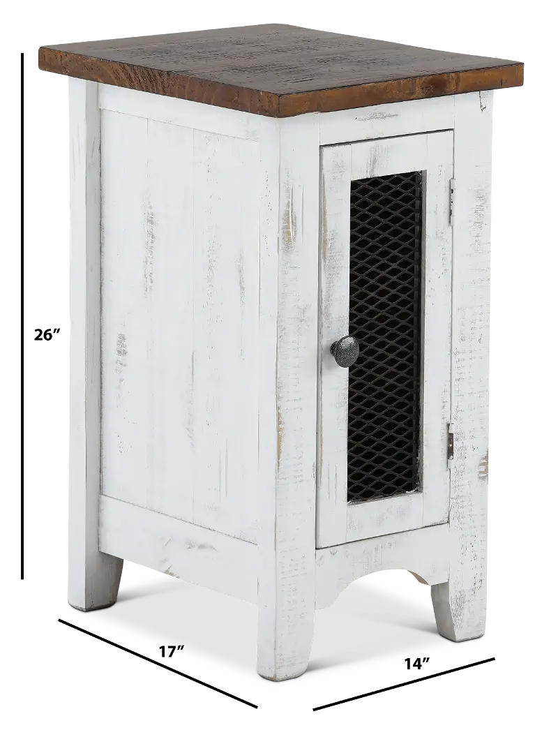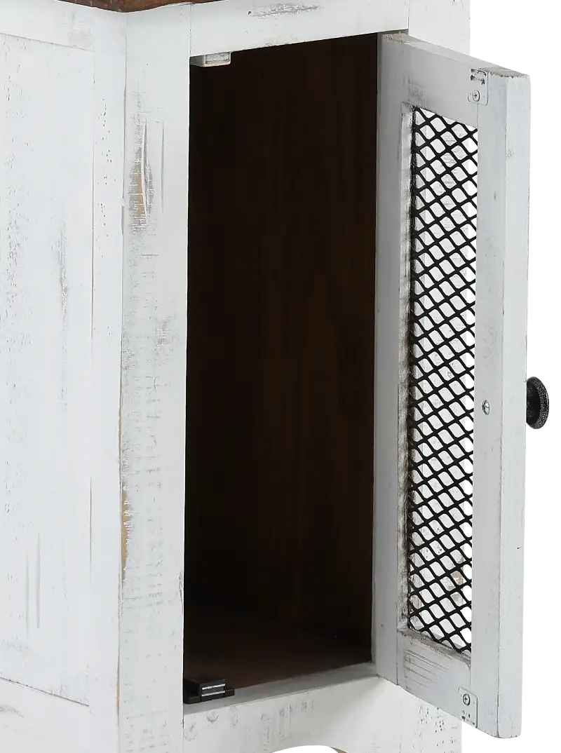 This adorable antique white chairside table is the perfect companion to your favorite easy chair. Ideal for a lamp, this table will help you create a cozy little reading nook in your home. The mesh accented door opens up to reveal storage space designed for books and magazines.