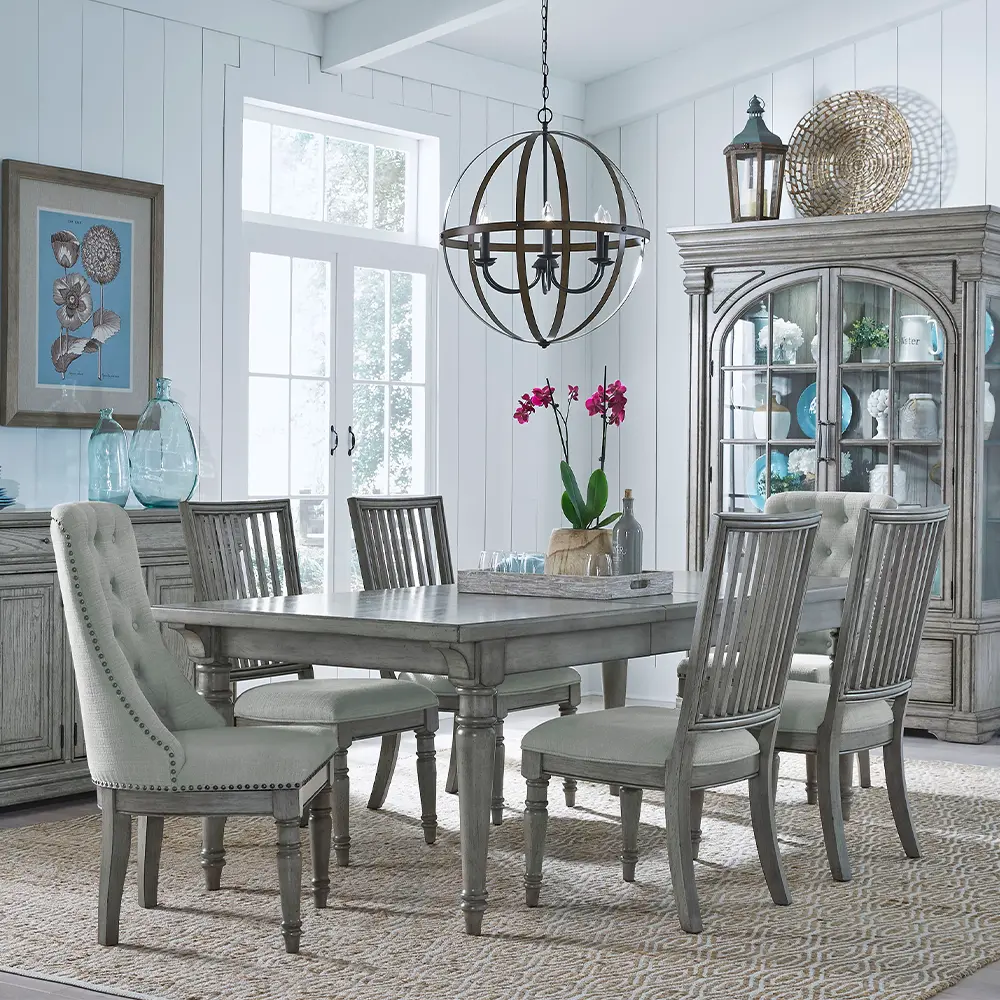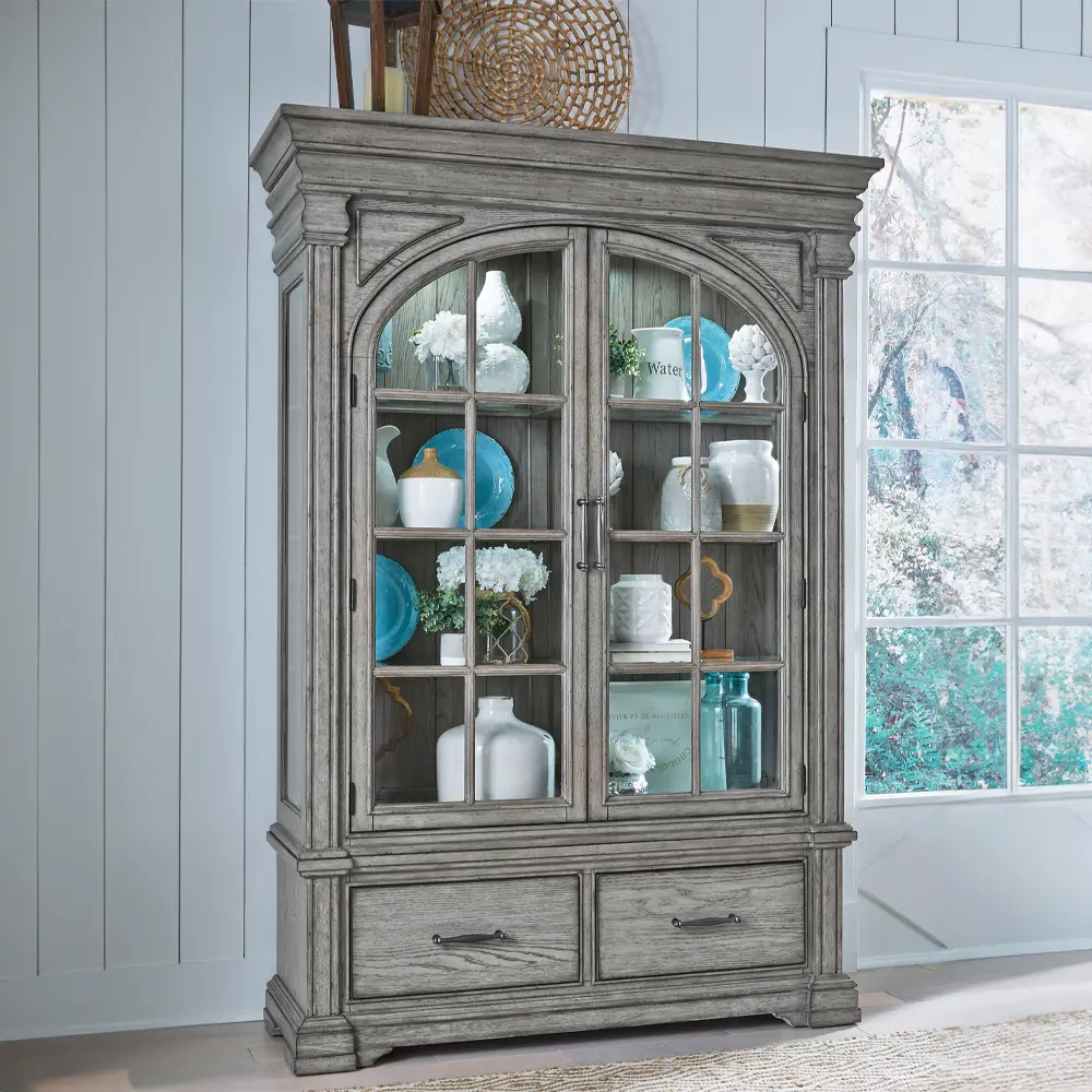 This traditional collection features grand designs, from a spacious gray dining table to a detailed china cabinet with arched doors, blending classic beauty with functional elegance.